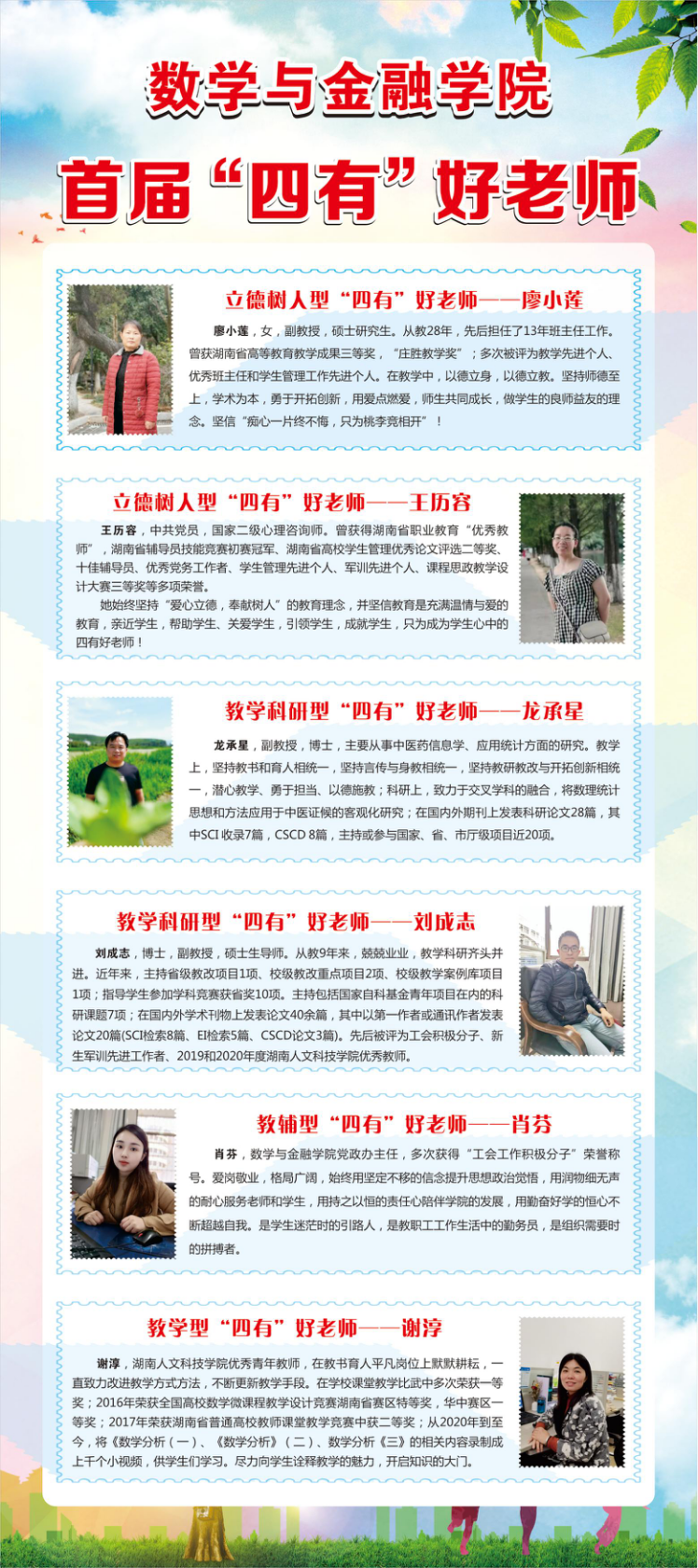 此次“四有”好老师评选活动为期一个月,通过自主申报、部门审核、师德师风情况公示及教职工评分四个环节,公平公正公开评选出立德树人型“四有”好老师2名、教学科研型“四有”好老师2名、教学型“四有”好老师1名、教辅型“四有”好老师1名。此次评选活动不仅有利于加强学院师德师风建设,也为引导学院教师全面贯彻落实立德树人根本任务起到积极的促进作用。(供稿人:肖芬)