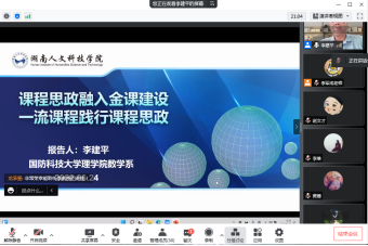 上午,学院特邀国防科技大学文理学院李建平教授、湖南交通工程学院副校长刘初生教授为教师带来两场关于提高课堂教学能力的讲座,讲座由院长李军成主持。李建平通过腾讯会议平台,以“课程思政融入金课建设,一流课程践行课程思政”为题,从理解思政的内涵、构建思政体系、践行课程思政、形成思政特色等方面,并结合自身在大学数学金课建设的经验,深入浅出地介绍了对课程思政的认识、实践与思考。刘初生以“加强课程建设,提升课堂质量”为题,从关注学生回归高教改革主流、聚焦课程推进一流本科教育、立足课堂提升本科教学质量等方面进行全方位的阐述与分析。