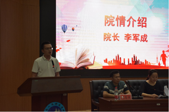 院长李军成做院情介绍,回顾了学院教育教学管理的喜人成果,展示了学院的巨大变化,充分肯定了师生的优异成绩,对学院的发展提出了指导性意见,对同学们的学习也指明了努力的方向