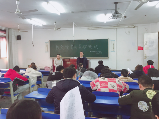为深入学习贯彻党的十九大精神,结合“两学一做”常态化、制度化工作,根据学校《关于学习宣传贯彻党的十九大精神的实施意见(校党发〔2017〕37号)》的要求,数学与金融学院党总支于2018年12月14日中午,在致远楼412组织全体学生党员进行党的基础知识测试,此次测试采取集中考试、闭卷作答的方式进行,内容涵盖党的十九大精神、新修订的《中国共产党纪律处分条例》等内容。学生党支部书记张蔚老师与陈芳老师担任监考老师。我院党总支书记阳立新到现场为党员们进行考前动员和指导,要求党员们诚信参考,认真考试。测试中,各位党员认认真真审题,仔仔细细答题,把测试活动当作一次学习研究的过程,真正达到了以考促学、以学促进的目的。