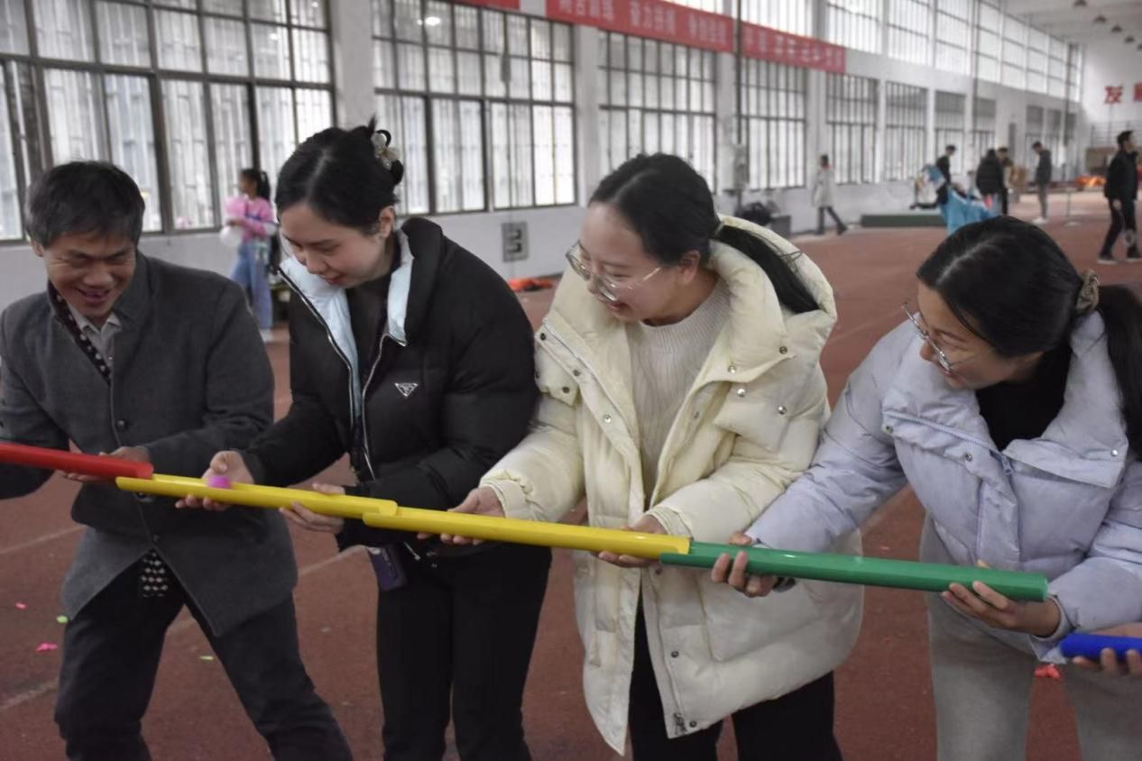 本次趣味运动会设置了“踩气球”、“珠行万里”、“极速60秒”、“摸石过河”等团体项目,既有趣味性,又能起到健身效果,更加注重团队配合。在简单的热身活动后,比赛正式拉开序幕。学院四个教研室通过抽签的方式组成超越队和超越超越队。两个队全心投入、团结协作,展现出了高度的默契和团队凝聚力。大家通过相互配合,充分放松自我,享受体育运动带来的乐趣。田径棚内气氛热烈,充满了欢声笑语。经过激烈的角逐,超越队取得了本次活动的最后胜利。