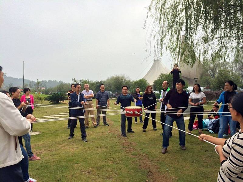 活动在高书记的讲话中拉开序幕,第一个环节为破冰小游戏,大家通过简单的破冰游戏进入角色;上午的活动是同心鼓竞技活动、有轨电车和贴身靠;下午游岛后,接着是信任背摔和无敌风火轮。