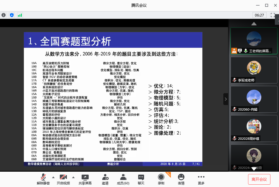 ,数学与金融学院特别邀请国防科技大学王丹博士通过腾讯会议平台为beat365数学建模暑期集训学员在线授课。授课活动分为上午和下午两场,beat365参加数学建模暑期集训的60名学员参加。