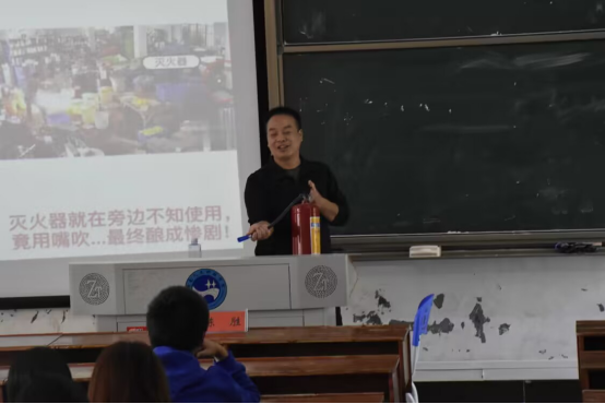 讲座中,陈胜浅谈了消防安全观念的几个误区,为同学们普及安全防范知识并示范灭火器的使用方法。陈馆长还提出了面对火灾时的“三要”“三救”和“三不”原则,告诉同学们要熟悉自己住所的环境,遇到突发情况时要沉着冷静,采取正确的应急措施。在认真听讲及观摩后,部分同学亲自体验了如何正确使用灭火器,为维护安全校园打下了坚实基础。