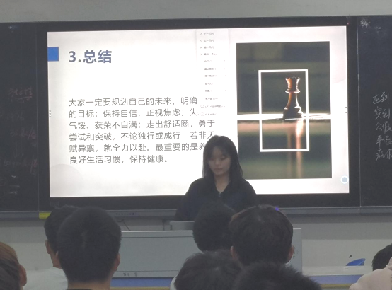 杨艳芳发言,她告诉同学们对未来要有明确地规划,勇于尝试和突破,养成良好习惯,保持自信。