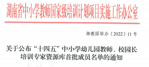 2022年12月8日,湖南省中小学教师国家级培训计划项目实施工作办公室发布《关于公布“十四五”中小学幼儿园教师、校园长培训专家资源库首批成员名单的通知》 (湘教国培办〔2022〕11号),本次专家资源库首批成员510名,经过专家集中审查、省教育厅审核后确定,我院党总支书记陈国华教授成功入选,承担教育理论与实践培训任务。