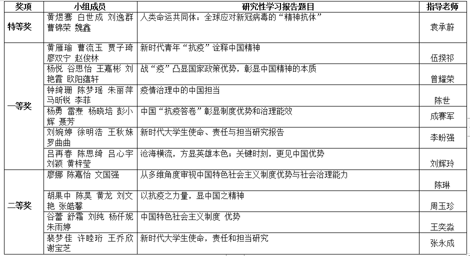随后,11个研究小组紧密结合习近平新时代特色社会主义思想以及当今中国国情分别对“多维度探究中国特色社会主义制度优势和治理能力”、“新时代大学生的使命责任与担当”、“新时代青年‘抗疫’诠释中国精神”、“疫情治理中的中国担当”、“人类命运共同体:全球应对新冠病毒的‘精神抗体’”等选题进行研究并从选题背景、选题意义、研究现状、研究性学习成果、研究设想以及研究性学习体会等六个方面全方位地展示了小组学习成果。