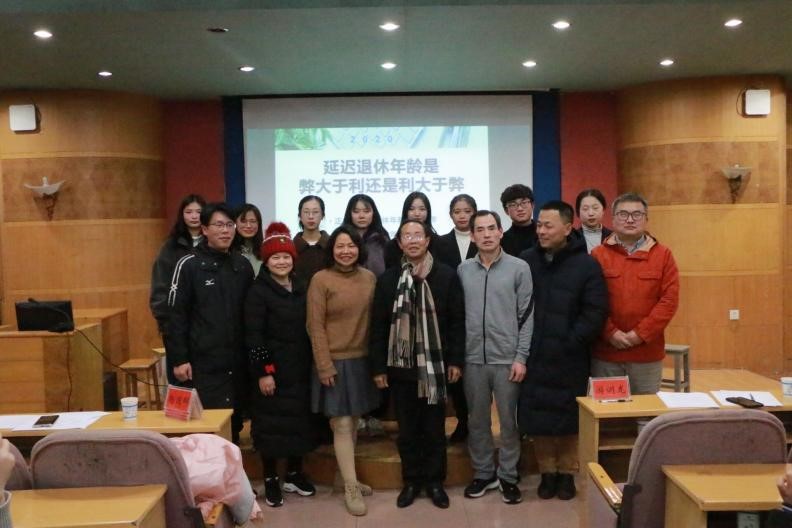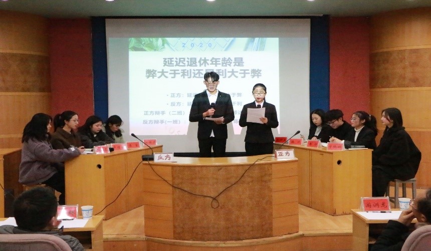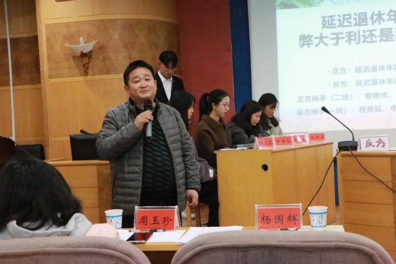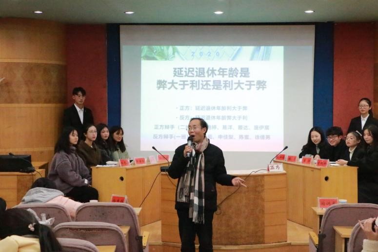 辩论赛在主持人宣读比赛规则和介绍参赛辩手后正式开始,双方辩手首先就“延迟退休年龄利大于弊还是弊大于利”展开辩论。正方紧扣“延迟退休年龄利大于弊”的观点率先发言,提出延迟退休的四大好处。反方也不甘示弱,结合当下老年人的身体健康状况以及退休意愿有力地辩驳了正方所提出的观点。自由辩论环节,双方辩友交替发言,慷慨陈词,尤其是反方二辩反应迅速,辩词犀利流畅。最终正方以“延迟退休年龄利大于弊”的观点取得胜利。辩论赛结束,谢科峰博士、刘辉老师对此次辩论赛做出总结评价。最后游训龙教授宣布最佳辩手为反方二辩申佳梨,优秀辩手为滕达、易洋、程思茹。