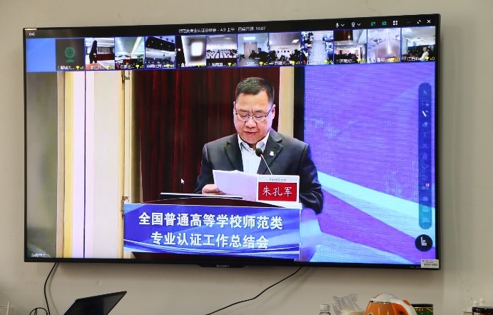 为学习贯彻十九届五中全会精神,深入领会中共中央国务院关于《全面深化新时代教师队伍建设改革》的意见以及中共中央国务院《深化新时代教育评价改革总体方案》文件精神,我院于4月9日在致远楼516组织我院专业教师观看了由教育部教师工作司指导,普通高等学校师范类专业认证专家委员会主办,教育部高等教育教学评估中心协办,华南师范大学承办的《全国普通高等学校师范类专业认证总结会》直播。观看此次直播的有我院院长张卫明教授、副院长杨国辉博士、袁承蔚博士、刘风雪博士、周小探老师。