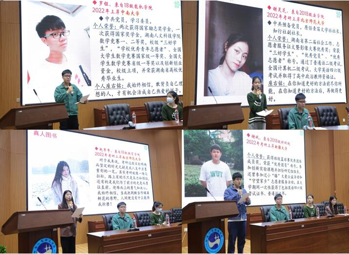 赵芊芊同学分享了自己成功上岸南京师范大学的经验。她看到了一组数据:2020年我国青少年的抑郁检出率为24.6%,并且有逐年上升的趋势。她觉得作为一个心理学专业的大学生应该要为社会做点有益的工作,立志考研提升心理学专业水平,将来当一名心理老师或一名心理咨询师,帮助更多需要帮助的人。她克服重重困难,在青春的赛道上奋力奔跑,深深地体会到奋斗是青春最亮丽的底色,志存高远方能登高望远,胸怀天下才可大展宏图。