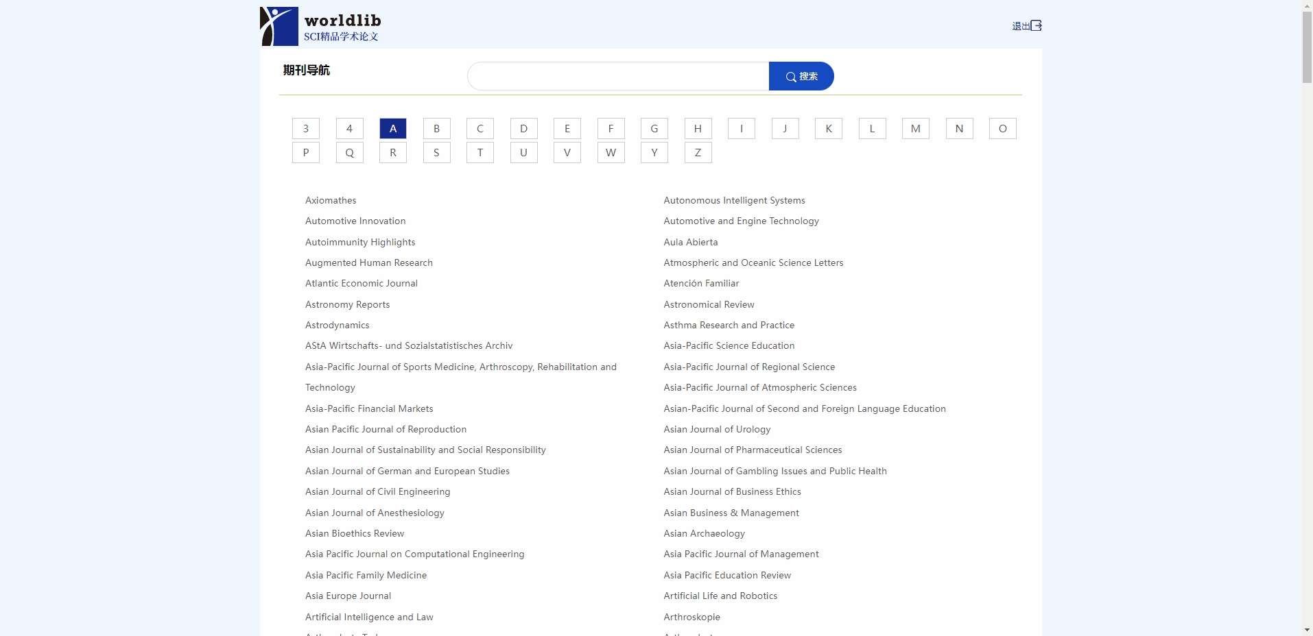 (2)期刊导航页,根据首字母排序,可以进行期刊名检索。点击选择期刊可以打开该期刊的期卷列表。