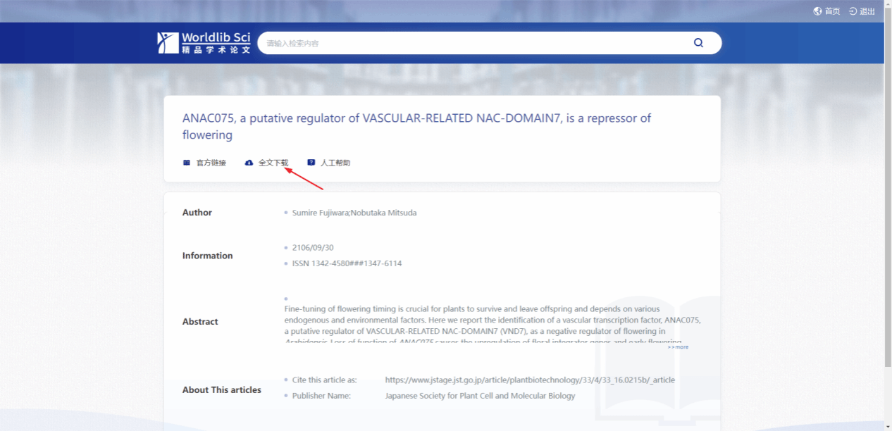 (4)进入文章详情页,可以查看该文章的作者,发表时间以及摘要等相关信息。可以直接点击右上角的下载按钮进行下载或在线全文阅读。