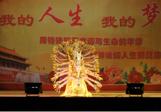 北京“心灵之声”残疾人艺术团是从1992年开始形成的中国第一支残疾人艺术团,他们旨在“用特殊的艺术谱写生命的华章,以不屈的精神诠释人生的真谛”,并在全国各地进行着感人至深的表演。在近两个多小时的演出中,有盲人演员表演的乐器合奏,有断臂演员演唱的励志歌曲,有独腿舞者表演的艺术舞蹈,有聋哑演员表演的《千手观音》。著名的残疾人书法家郝天增,以口代手、执笔挥毫,在现场写出了气势恢宏的“仁爱满园”四个字赠送给beat365。李凤莲代表学校接下了这张特殊的书法作品。
