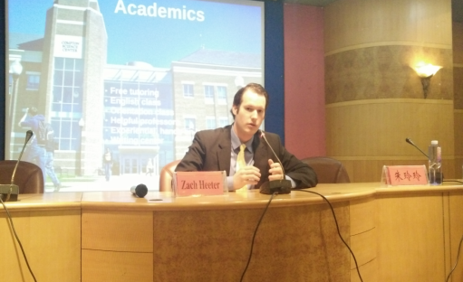 宣讲会上,Larissa用PPT介绍了弗罗斯特堡州立大学的地理位置,怡人的气候环境;Zach详细阐述了该校便利而现代化的教学环境,丰富的娱乐项目,学生优良的居住环境,费用减免,学业成就各方面的优势,并以播放该外校宣传片的形式,生动展现了该校的校园文化。