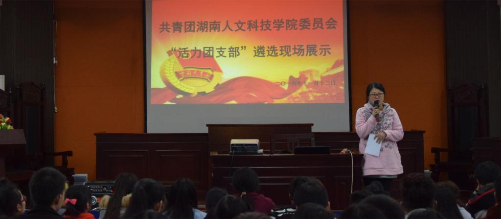 2016年11月12日晚7:30,由共青团湖南人文科技委员会主办的“活力团支部”遴选活动在致远楼202室举行。由校团委专干老师刘佳、校团委学生副书记刘建新和10个二级学院的团总支副书记组成评委团对10支进入决赛的团支部进行了评审,150余名团员青年观摩了本次活动。