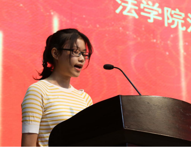 法学院江羽佳代表本科新生发言。她说,远离家乡,虽有不适,将尽快融入大学生活,努力进取,放飞自己的青春梦想。
