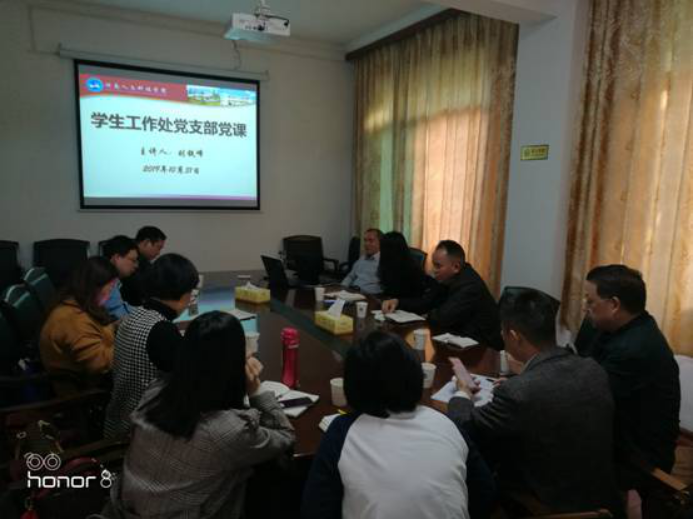 10月31日,学校党委委员、副校长刘铁峰在明德楼218会议室以《不忘初心、牢记使命,充分发挥党员先进模范作用》为题,为学生工作处党支部全体人员上主题教育党课想,学工处、团委全体党员参加此次党课培训。