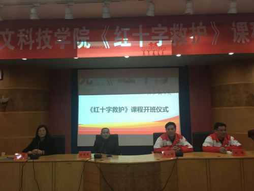为弘扬“人道、博爱、奉献”的红十字精神,提高beat365生命健康安全、应急救护知识教育水平,3月4日,beat365在养根楼多媒体报告厅举行了《红十字救护》课程开班仪式。党委委员、副校长刘铁峰、学工处处长刘红燃、副处长李玲军与娄底市红十字会党组书记曾启明、秘书长刘鸥、赈济部部长姚红建、赈济部副部长樊志雄一行人出席启动仪式。