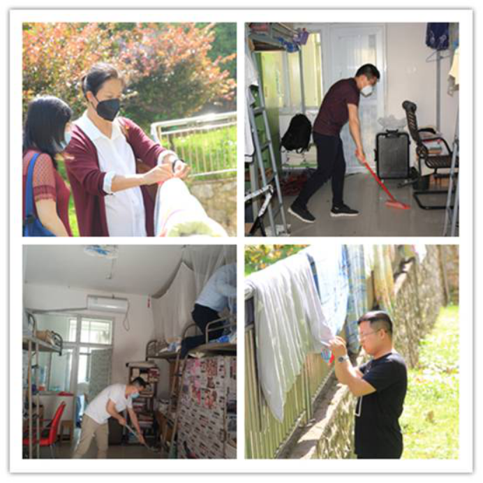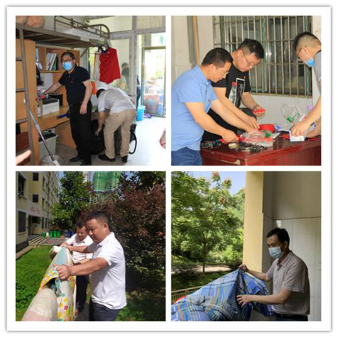 老师们仔细清扫寝室卫生、袋装垃圾,并在充分尊重同学们的前提下,整理书桌上书籍、文具、衣物和生活用品。为了防止被褥出现丢失、混淆的情况,细心的老师们专门用红色布条系扣并标记上寝室号和姓名。学院学工办通过QQ、微信等平台对此次活动向学院全体教职员工、学生图片、视频的展示和分享。老师、同学们在社交平台中纷纷感慨:“暖到了!”、“老师们、辛苦了”、“点赞!学校太暖心了!”、“爱了爱了,我大人文”、“做人文学子太幸福了...”学生们深受感动,纷纷表示会在家里努力学习,积极参加劳动锻炼,遵守疫情期间的相关规定,不辜负老师们的良苦用心,期待早日重返美丽校园。