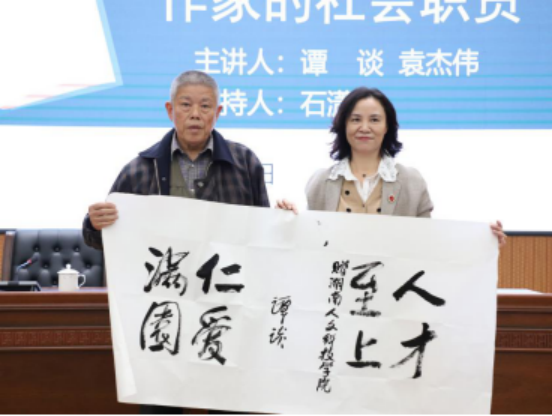 讲座中谭谈以毛泽东文学院的创建,爱心书屋及老农活动中心的创办为例,表达了一个不负时代重托的老作家的赤子之心。袁杰伟表示,作家写作应态度严肃真诚,源于生活,深入生活,并以巨大的热情拥抱时代精神,以小我写出大我,与时代精神融为一体。