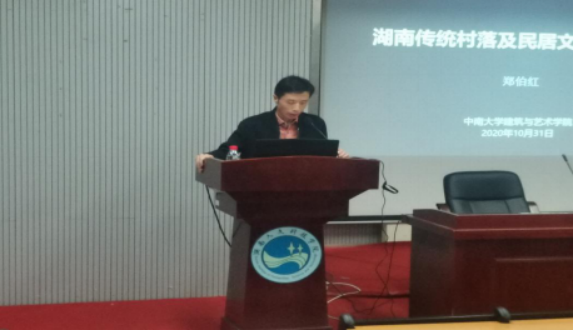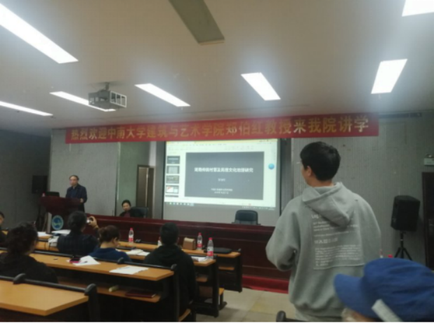 10月31日晚,中南大学建筑与艺术学院郑伯红教授在逸夫楼报告厅为我院师生做了《湖南传统村落景观的文化地理研究》的报告,校教师发展中心主任毛攀云教授,美术与设计学院学院副院长陆序彦教授及环境设计教研室全体师生参加了此次讲座,讲座由陆序彦主持。