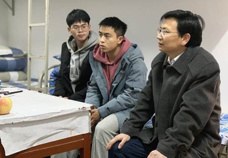 “学校食堂的菜品还满意吗”,“有没有做好大学期间职业规划”,“在专业学习上有哪些困难”……在学生寝室里,陈志国仔细倾听,并详细询问了寝室各位同学的在校学习生活状况,对每一位同学的意见和想法都作了回应。他表示,同学们如果在学习、生活中遇到困难可以主动联系辅导员、班主任,老师们都会尽力帮大家解决问题,学校也会为大家创造良好的学习生活环境。陈志国又带领同学们进一步学习党的十九届五中全会精神,对此作了进一步阐释和深入解读。同时,他对大家提出了三点殷切期望:一是要在专业学习上下功夫,打好基础,明确目标;二是要积极参加体育锻炼,强身健体;三是要关心关爱班级同学,打造团结凝聚的班集体。