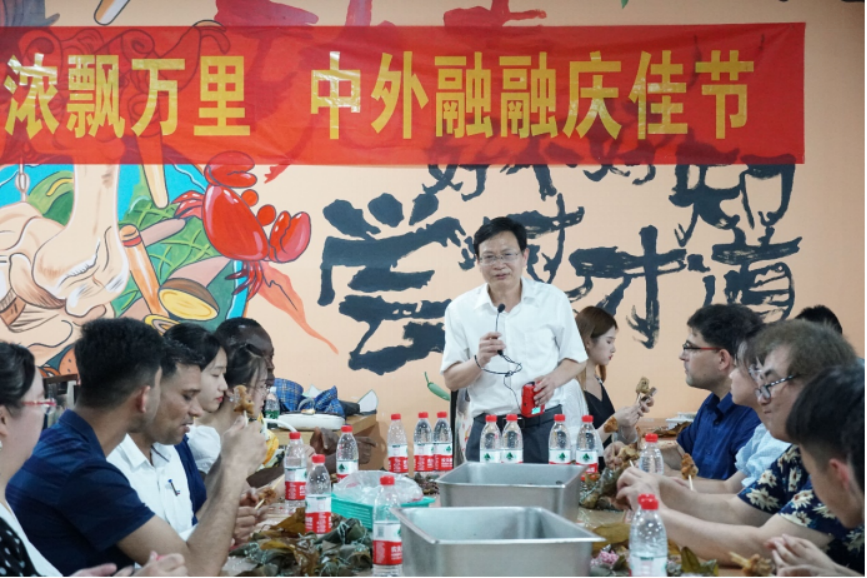 为增进国(境)外人士对中华优秀传统文化的了解,增强中国传统节日的文化吸引力,6月10日,国际合作与交流中心(港澳台办)组织了“粽香浓浓飘万里,中外融融庆佳节”端午节主题活动,副校长陈志国出席并致词,文学院院长倪正芳及部分教师代表,在校国(境)外专家、留学生代表,中外文化交流协会学生代表等50余人参加。