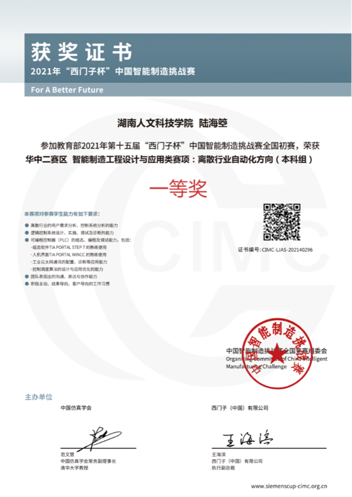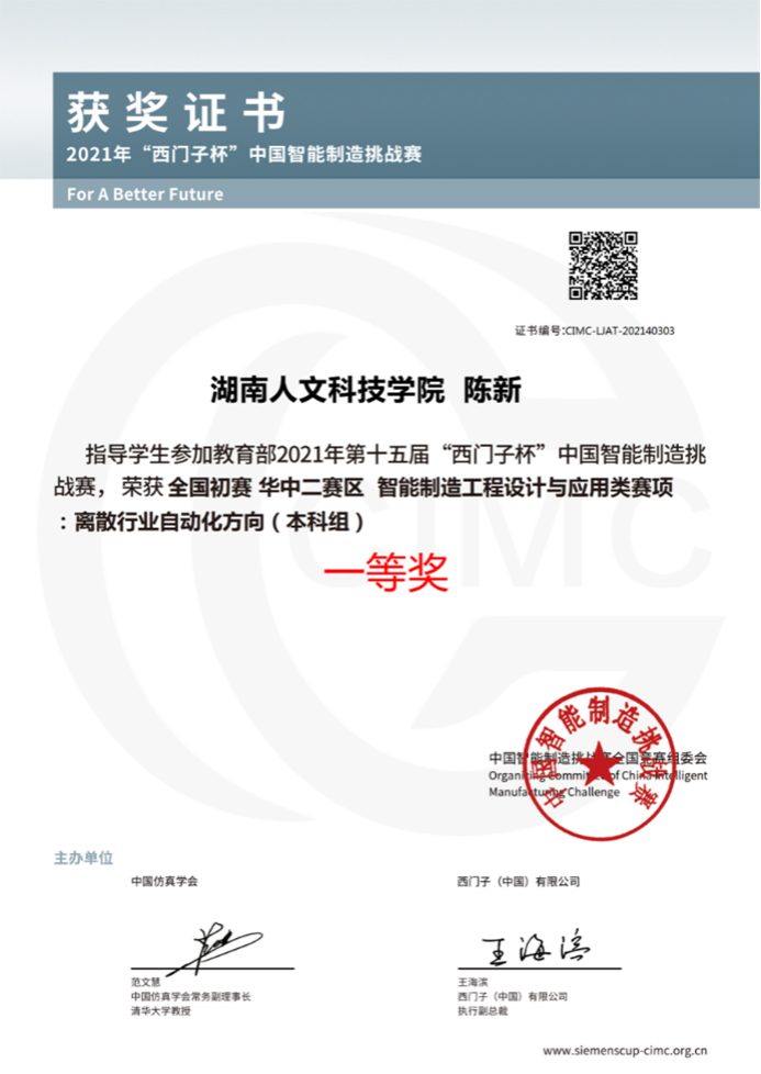 教育部2021年第十五届CIMC“西门子杯”中国智能制造挑战赛全国初赛于7月举行,本届初赛共有来自全国600多所高校16000余名师生参与。我院陈新教授指导的张志豪、陆海箜和黄超斐组成的“阳光大男孩”代表队荣获华中二赛区一等奖。