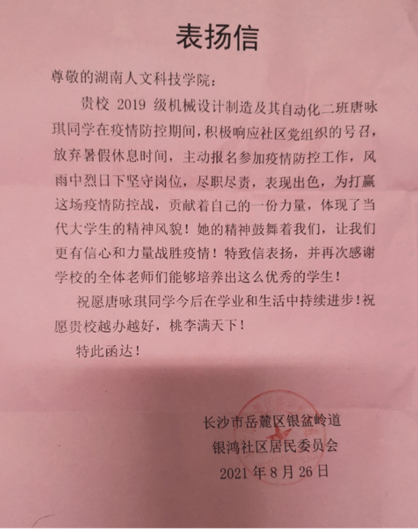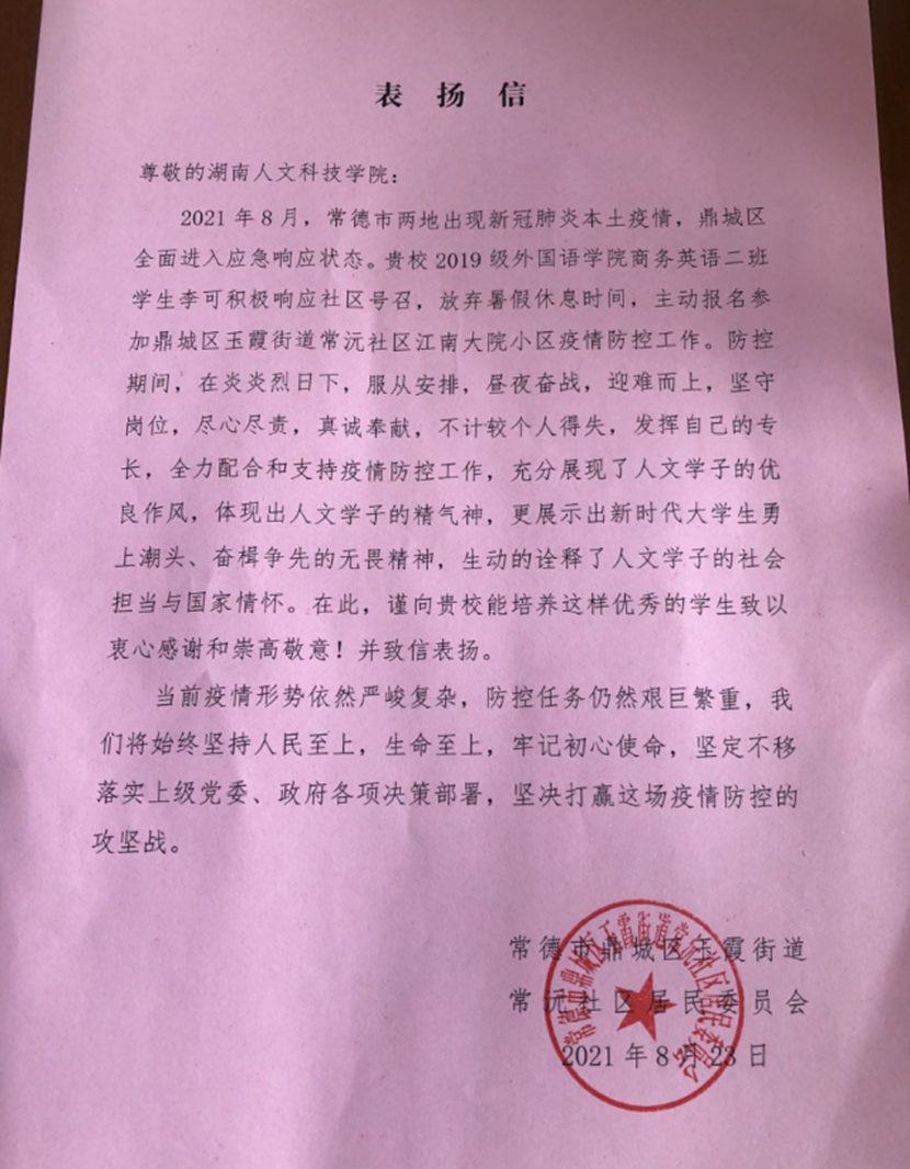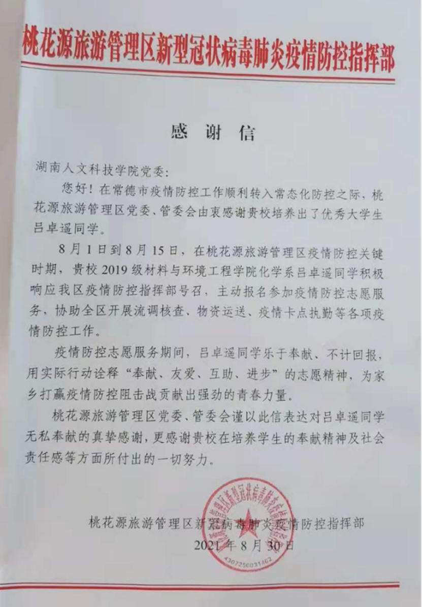 近日,beat365先后收到长沙市岳麓区银盆岭道银鸿社区居民委员会、华容县章华镇华阳街社区委员会、桃花源旅游管理区新冠病毒肺炎疫情防控指挥部、常德市常沅社区等单位发来的感谢信或表扬信。信中,对beat365能机学院唐咏琪、法学院张佳、材环院吕卓遥、外院李可等同学加入志愿者服务队伍,为当地疫情防控工作所做的贡献表示感谢和赞扬,对beat365厚植学生爱国情怀、培育社会责任感方面的工作给予高度肯定。