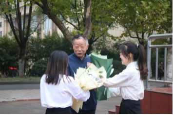 在国旗下,学生向学院退休教师代表颜智殊敬献了鲜花,表达了师生的感恩知情。颜智殊老师表示,在这个节日能够参加升旗仪式让他很感动。颜老师讲述了过去与现在的对比,勉励大家一定要坚定理想信念,爱党、爱国、爱社会、爱学校、爱学院,力争做一个优秀全面发展的大学生。