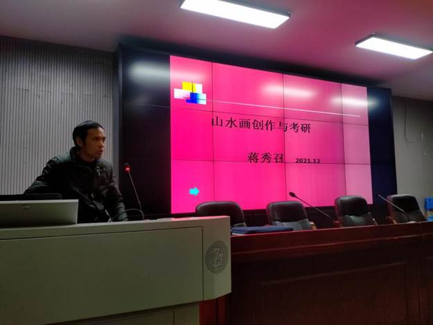 12月21日下午,美术与设计学院报告厅,灯光明亮,新装不久的演讲台显得格外醒目。美术学专业教师蒋秀召以山水画创作与考研为题,结合自己有关山水画创作研究的心得体会,为美术学专业师生作了一场学术讲座。