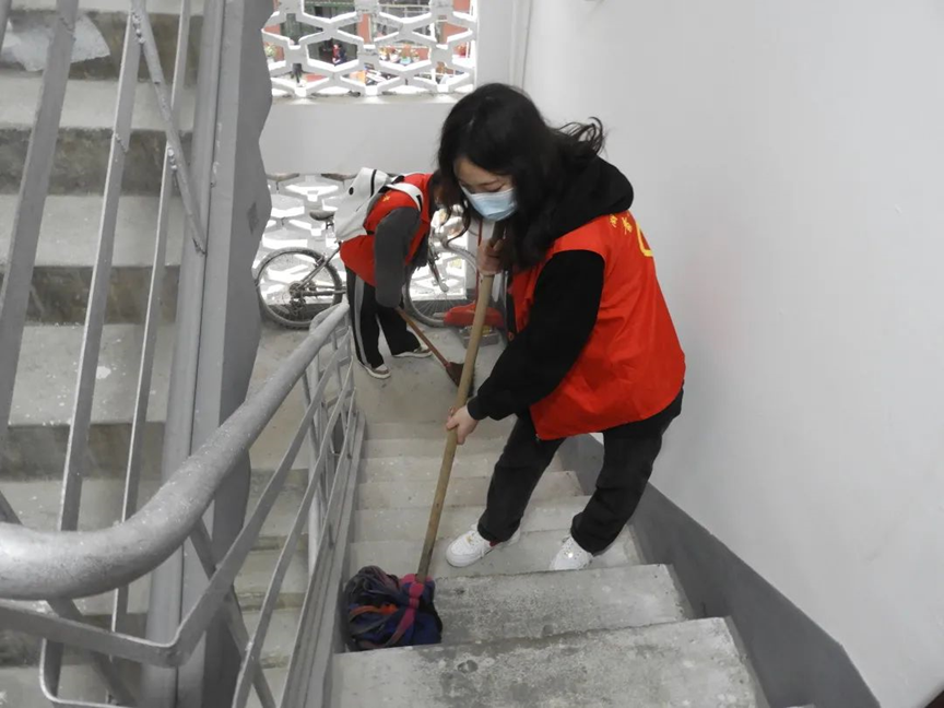 (图为志愿者们打扫五义苑楼道)