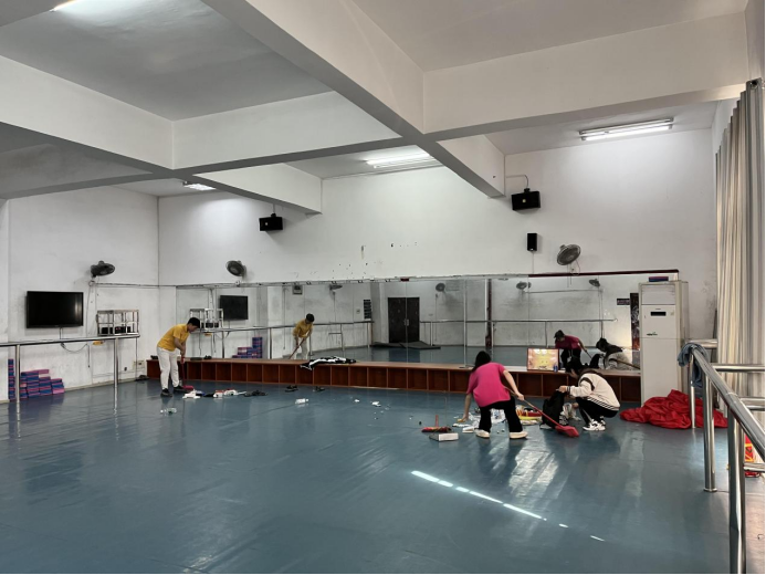 (图为志愿者们打扫教室)