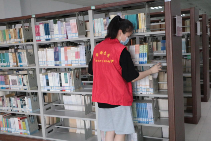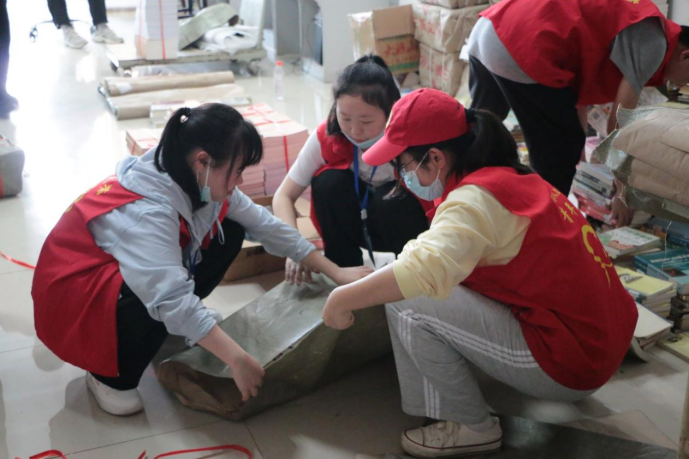 在图书馆邱圣晖老师的分工安排下,50名青年志愿者分成6个小组,分别负责文科书库、社科书库、自科书库、密集书库、编目室和学术交流中心的图书整理及卫生清扫工作。志愿者们在明确活动任务和注意事项后,便迅速投入到志愿服务工作中,图书馆中随处可见“红马甲”忙碌的身影。志愿者们有的在整理打包破损书籍,有的在清扫馆内卫生死角,有的在协助图书馆管理员做好新书入库等。经过志愿者们一下午的辛勤努力,图书馆书库变得井然有序,卫生环境恢复干净整洁,方便了同学们查找、借阅书籍,也为前来自习的同学们提供了干净舒适的学习环境。