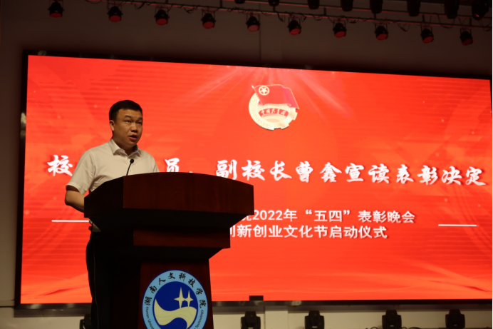 校党委委员、副校长曹鑫宣读了《关于表彰2020-2021年度共青团工作优秀集体和个人的决定》、《关于表彰2022年抗疫先进个人的决定》和《关于表彰“四会”教练员的决定》等表彰文件。随后,参会的校领导依次为2021年度团学工作优秀个人、先进集体和在全国、全省文体竞赛、学科竞赛、创新创业比赛中获奖的团队和个人颁奖。