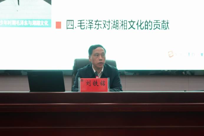 刘铁铭从毛泽东伟大的一生、走进湖湘文化、青少年毛泽东的湖湘文化背景和毛泽东对湖湘文化的贡献四个方面来带领学员们走进青少年时期毛泽东与湖湘文化。他从重要历史时间点切入,向学员们们介绍了毛泽东一生四大历史功绩,即创立了一个新的中国——中华人民共和国、建设了一个先进的党——中国共产党、缔造了一支人民的军队——中国人民解放军、创立了一个科学的理论——毛泽东思想。他强调,中国共产党是一个焕然一新的政党,其最大的优点是勇于革命,有能力、有魄力、有办法反对和纠正党内一切脱离人民群众、腐蚀党的健康肌体的消极现象,勇于寻找自身的不足。他希望广大青年学员们通过回顾毛泽东青少年时期成长点滴,能够有所激励,在人生的道路上眼有星辰大海,心中繁花似锦,肩负时代使命,书写青春华章。