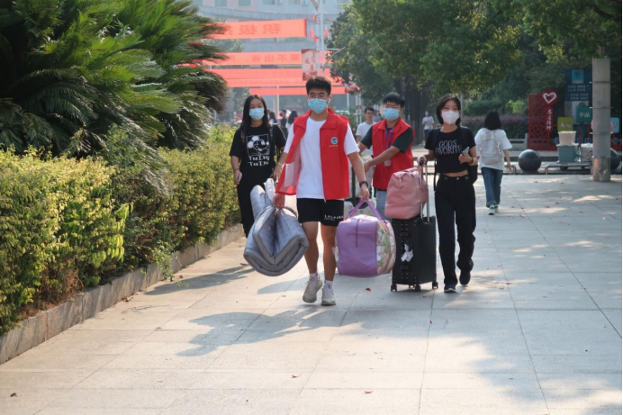 学校在高铁站、火车站、汽车南站和学校海园广场设立接待点迎接新生。11日各个学院和校级学生干部就分批为新生宿舍做好了清扫工作,布置好了迎新站点。12日早上7点,志愿者就抵达迎新点,迎接新生的到来。在校外车站接待点,志愿者在经过核验信息、行李消杀、体温检测、查验健康码后,引导新生乘坐迎新车辆顺利抵达海园广场报到;在海园广场各学院服务点,志愿指导新生办理入学手续,领取军训服,主动帮助新生搬运行李,迎接新生入住宿舍。迎新车辆穿梭在各接待点之间,热情欢迎新生的到来。从学校大门、咨询服务点、学院报到处、新生宿舍等场所,都能看到志愿者们忙碌的身影。