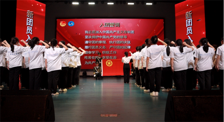 在庄严的入团仪式上,校团委副书记刘佳宣读新团员名单。与会领导老师为30名新团员佩戴团徽、颁发团员证。团员代表熊朝霞同学带领全体团员青年面对团旗庄严宣誓。