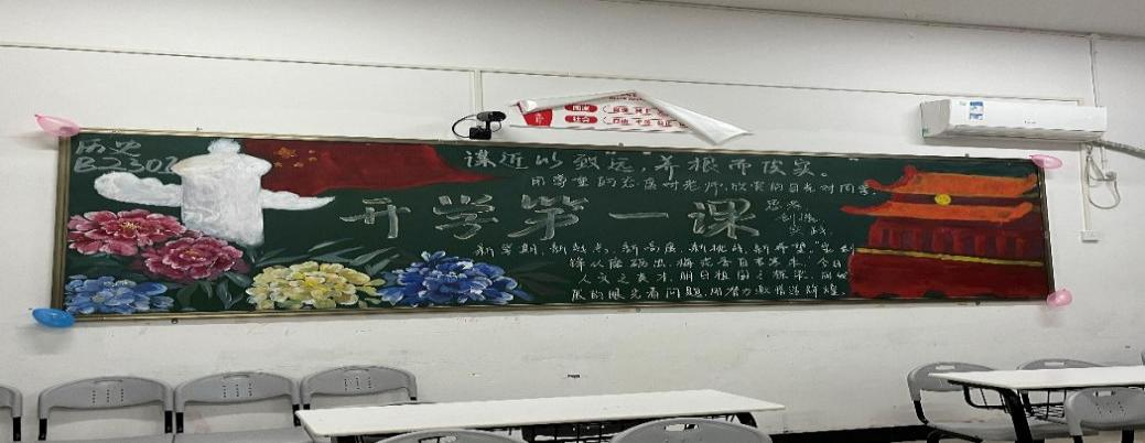 (图为同学们布置“开学第一课”主题板报)