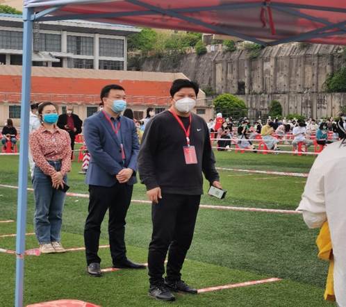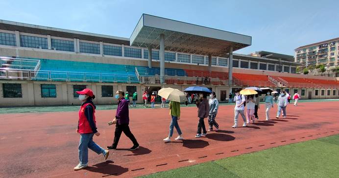 4月6日清晨,志愿者们就前往田径场布置场地,搭帐篷、摆凳子、贴“一米线”。下午2:30,核酸采集工作正式开始。15个院师生按照核酸检测分组表分批次采集,各学院提前组织安排,学院总支部书记、副书记、辅导员均全程参与本学院学生的检测管理工作。志愿者们引导前来采集核酸的师生有序排队、戴好口罩、逐一查看他们的健康码、维持秩序,随后带领他们按照事先规定好的时间、路线前往场地进行采集,实现无缝对接、有序配合,整个核酸采集过程快速高效。