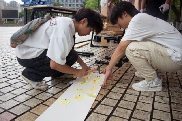 团体活动区“锤就完了”则展现工科生的浪漫匠心。数支队伍围绕主题图案,通过协作钉入数枚铜钉,在木板上共同“绘制”机械美学画卷。参赛队伍需精确计算钉子间距、合力控制锤击力度,最终呈现的作品既彰显专业特色,又隐喻“压力分解”与“团队支撑”的深意。