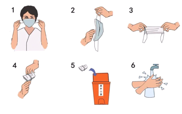 防疫期间,摘口罩前后做好手卫生。废弃口罩丢弃之前,应折叠成长条形后用挂耳绳捆绑成型,将口罩折叠时应将口鼻接触面朝外,有条件的应进行酒精消毒。废弃口罩放入垃圾桶内,每天两次使用75%酒