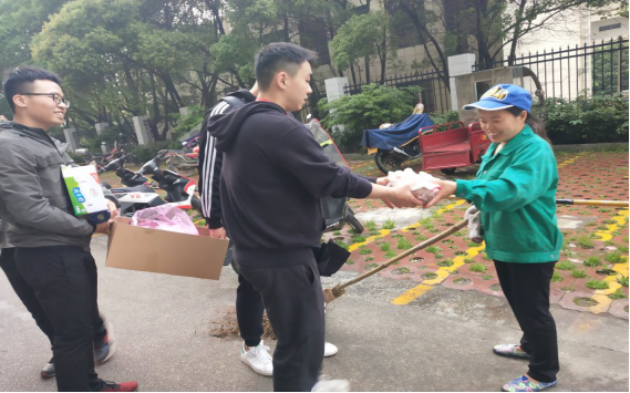活动进行第二项,由体育学院团总支学生副书记刘光杰带领11位成员前往校内阳光公寓为环卫工人送去面包、牛奶和手套等爱心物品,为校园内的环卫工人送去温暖。