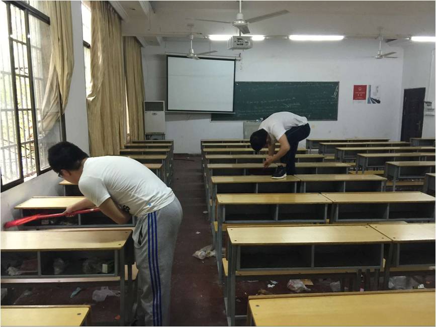 临近期末,为了保证体育学院有良好的期末考试环境。徐彬辅导员亲自带领学生会干部对博达教室卫生进行了打扫。博达楼的教室卫生一直是一个大问题,由于大一班级有限,导致有些教室没人打扫,抽屉里面垃圾很多,为了营造良好的考试氛围,在考前对教室卫生进行打扫是有必要的。在打扫过程中,学生干部们不怕脏、不怕累,发扬了我们体育生吃苦耐劳的精神,也充分发挥了学生干部的模范带头作用。经过打扫,教室变得干净整洁,大家虽然都已经累得满头大汗了,但是没有一个人抱怨。