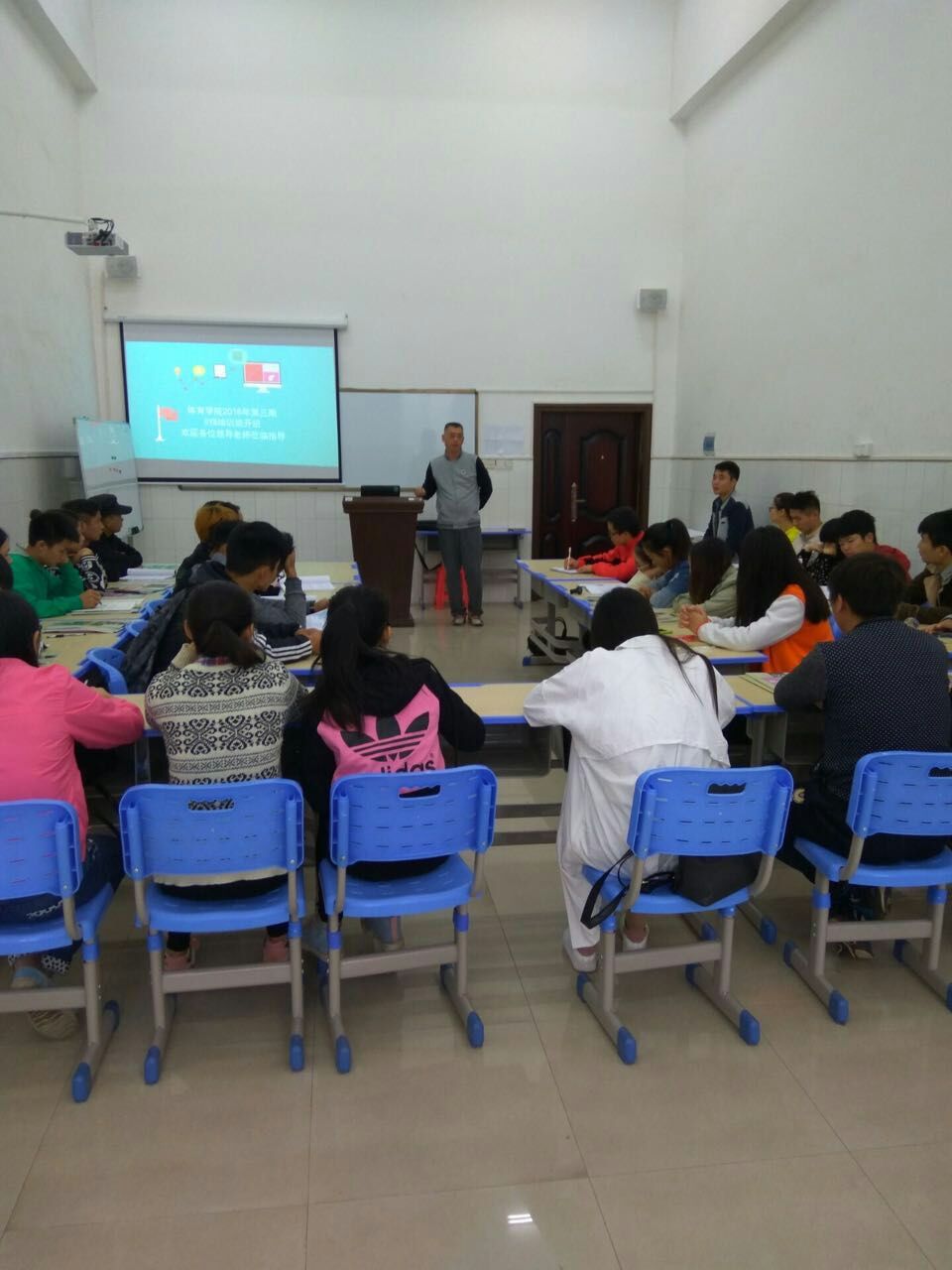体育学院2016年第三期SYB创业培训班开班仪式于10月27日上午8::20在体育馆三楼SYB教室举行,参加开班仪式的领导老师有双创学院谢柳书记、奉晓波老师、谢丽老师;体育学院院长刘玉江、班主任杨鑫和唐勇老师。开班仪式中,刘院长对本期SYB的三十名学员未来的创业就业给予了很大的期望和鼓励,并感谢双创学院各位领导老师对我院SYB培训相关工作的大力支持。