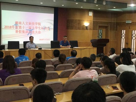 为了在2018年湖南省第十一届大学生运动会中取得优异成绩,做好赛前集训工作,7月3日下午,学院体委召开了赛前暑假集训动员大会。学校党委副书记、校体委主任刘铁铭,校体育常务副主任、体育学院院长刘玉江,体育学院党总支书记蒋毅等领导班子成员,以及体委蒋茂贵、柳佑华老师、11个代表队领队、教练员、运动员参加了会议。