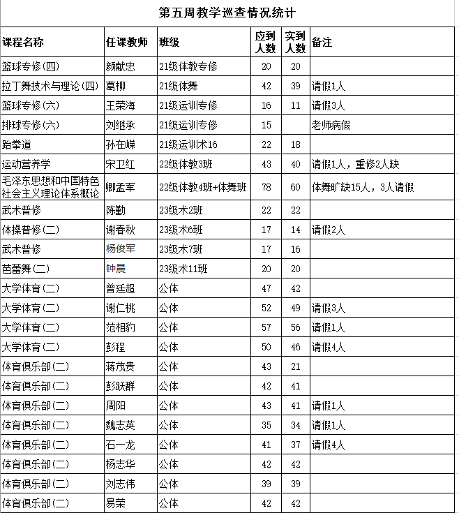 2024年3月27日上午3、4节课,由曾黎副院长带领杨赳赳老师、彭玉宇老师、罗凤娥老师组成的巡查小组对博达楼、体育综合馆、体育馆等教学场地上课教师进行了常规教学巡查,现将巡查结果通报如下:绝大部分任课教师都能提前到达教学现场,做好上课准备,教学文件携带齐全,上课组织规范。个别老师有请假手续不齐全和请学生代课现象。