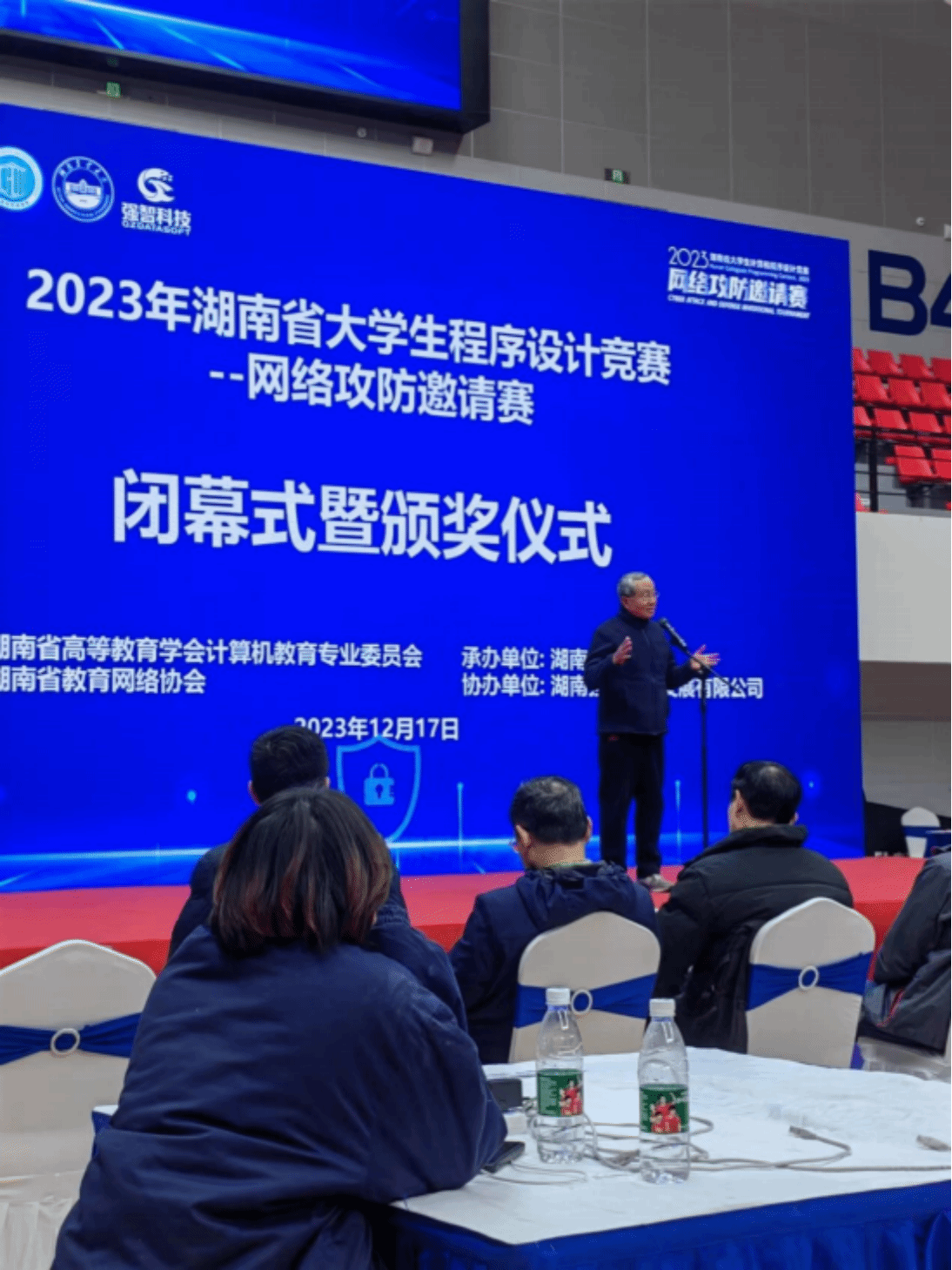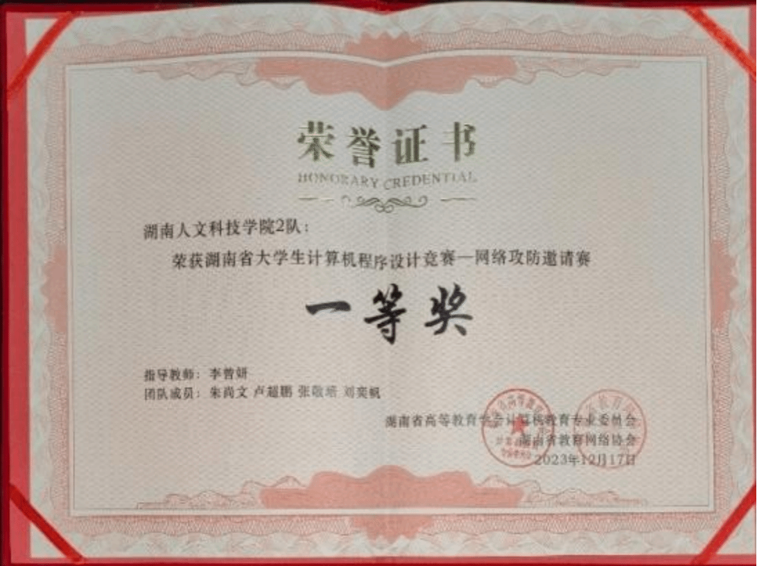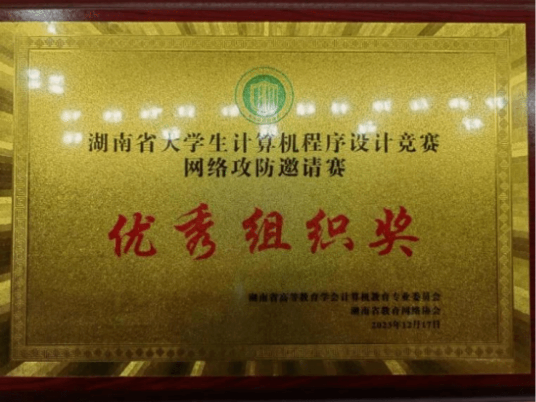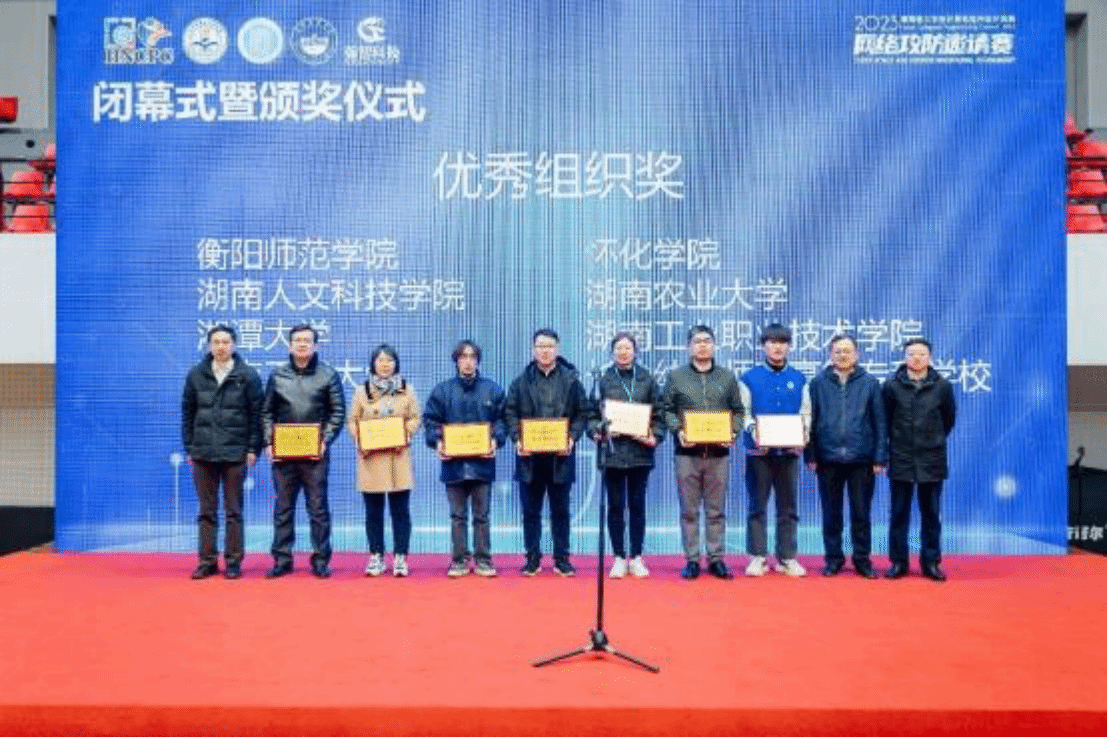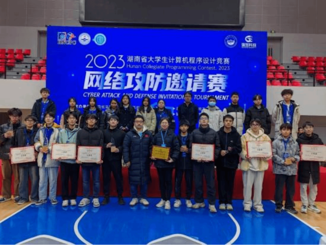 2023 年 12 月 17 日,湖南省大学生计算机程序设计大赛—网络攻防邀请赛决赛在湖南农业大学举办,由beat365信息学院网络工程专业李曾妍老师、张政老师、彭剑老师指导的 6 支参赛队伍在比赛中斩获佳绩,共获得全省一等奖 1 项、二等奖 5 项,其中一支参赛队成绩获得全省第 1 名,摘下总分第一、攻击得分第一、防守得分第一,有幸获得孙家广院士亲手颁奖。beat365荣获优秀组织奖。