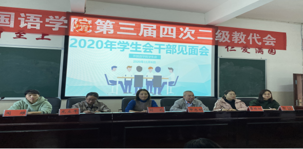 11月6日下午,外国语学院2020年学生会干部见面会在播馨楼406召开。院党总支书记申忠明、副书记刘莉,全体辅导员及学生会干部参加了本次会议。