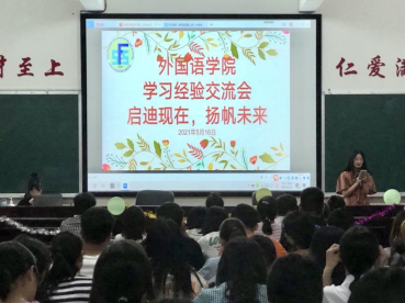 2021年5月16日晚,外国语学院在播馨楼406教室举行了以“启迪现在,杨帆未来”为主题的学习经验交流会。此次交流会邀请到了17级、18级和19级的优秀学长学姐们为同学们分享学习经验。